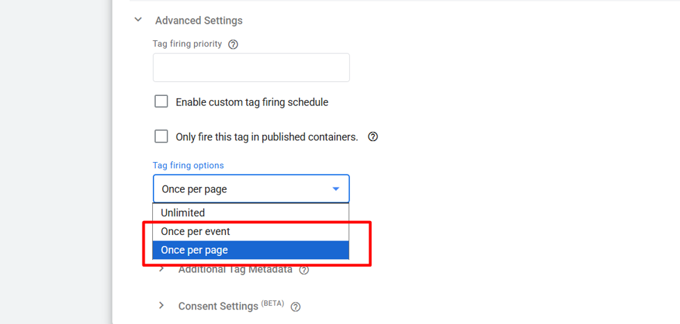 By default, “Once per event” means the tag is triggered every time an event occurs. Changing it to “Once per page” ensures that the tag is triggered only once per page load, regardless of how many times the same event occurs in the dataLayer.