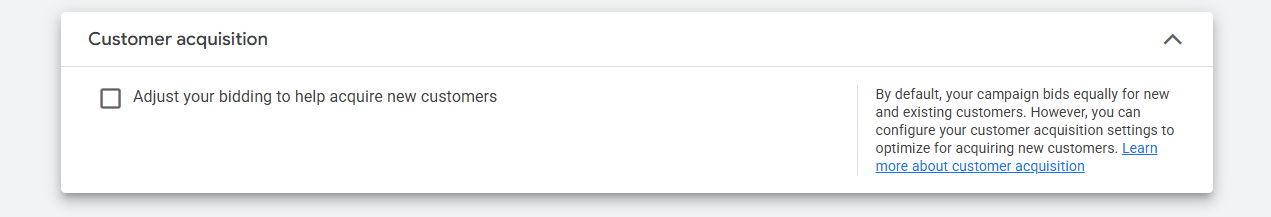 This customer acquisition setting in Google Ads controls whether your campaign prioritizes acquiring new customers instead of treating new and existing customers equally.
