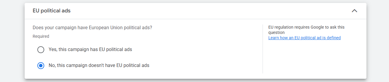 If you are targeting the EU with your political ads, choose the “yes” option. Otherwise, select the “no” option.