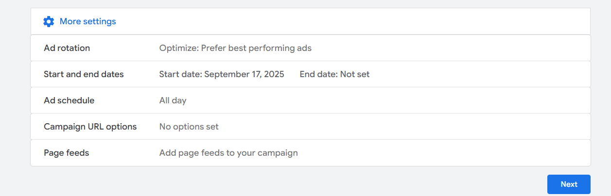 Campaign URL options: With this option, you can set up UTM parameters for your campaign. Page Feeds: Enables you to provide a list of website URLs so Google can better match ads with relevant landing pages. But you can avoid this setting.