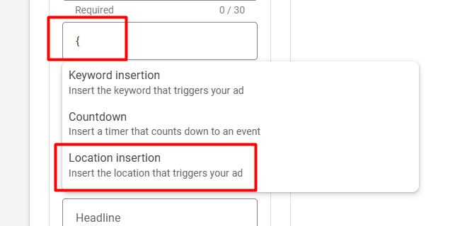 To set up this location insertion, first go to your ad copy and in the headline type “{” the third bracket. After typing the third bracket, all these options will be in front of you.
