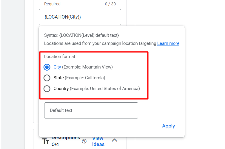 The default text serves as a backup. If, for any technical reason, Google Ads is unable to dynamically insert the relevant location (city, state, or country) into your ad copy, the system will use this pre-written default text instead.