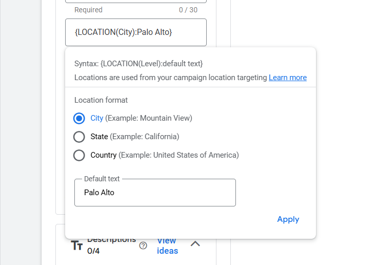 Instead of trying to cover every location individually, you can use location insertion. This technique allows you to dynamically and instantly tailor your responsive search ad text to your customer’s specific location, ensuring your ads are highly relevant—all with just one line of ad copy.