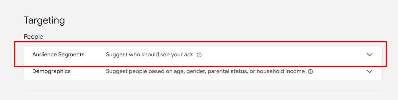 After clicking on “Add targeting,” here you can see a total of 5 options Google provided us for audience targeting. Let’s explore one by one.