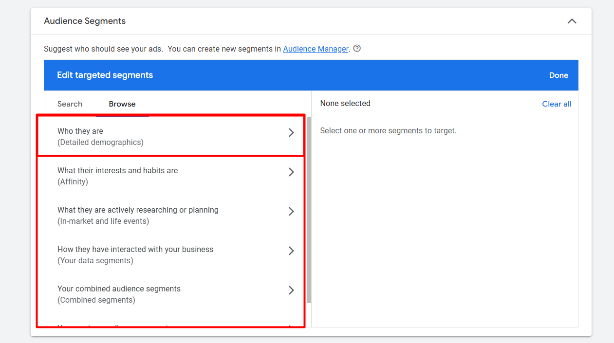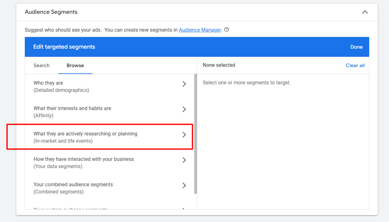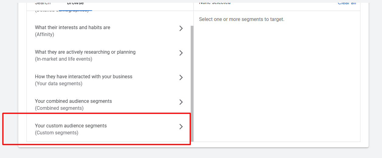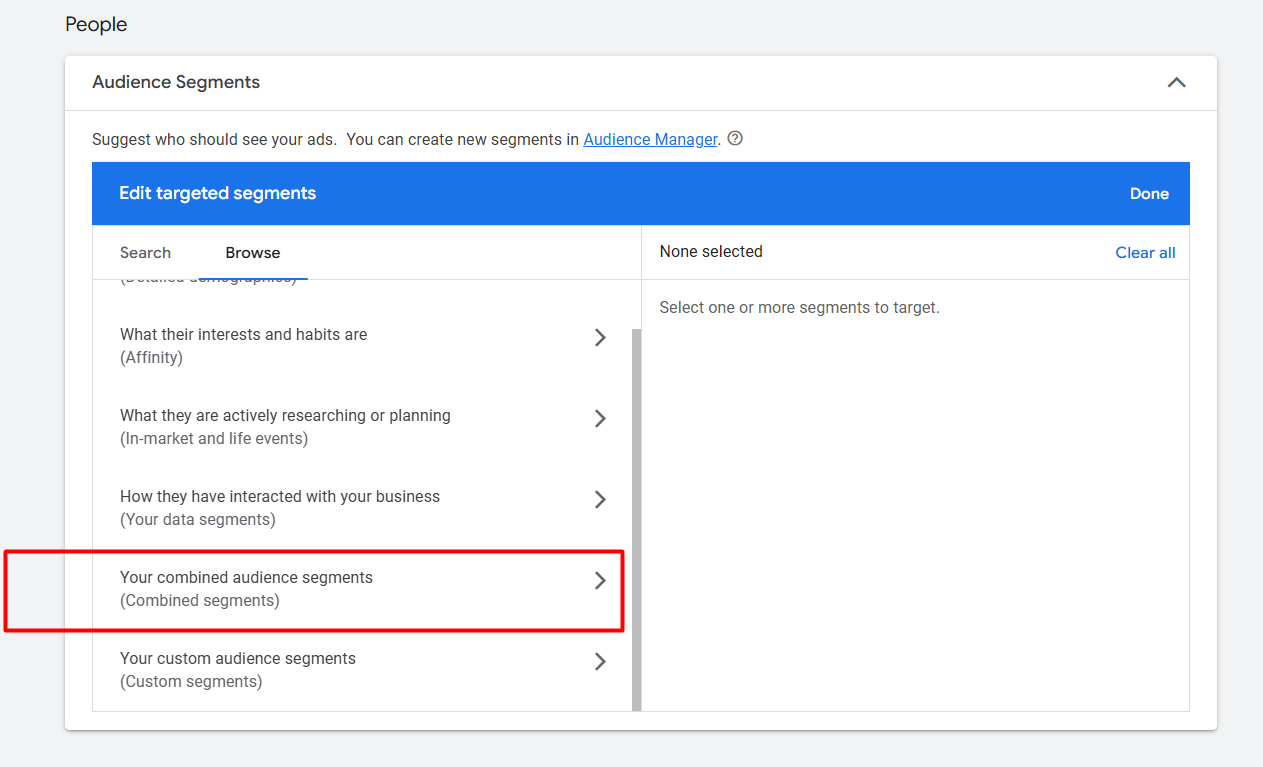 With this option, you can create a combined audience segment. This allows you to build your audience by incorporating Affinity, In-Market, and Life Events audiences. Additionally, you can also include custom segments in this combined list.
