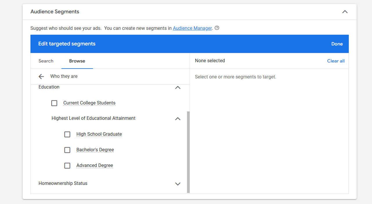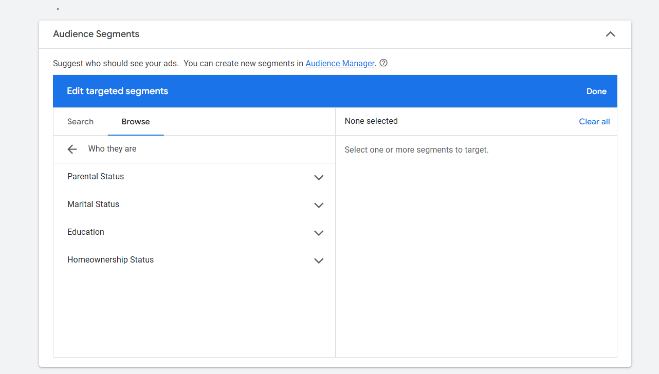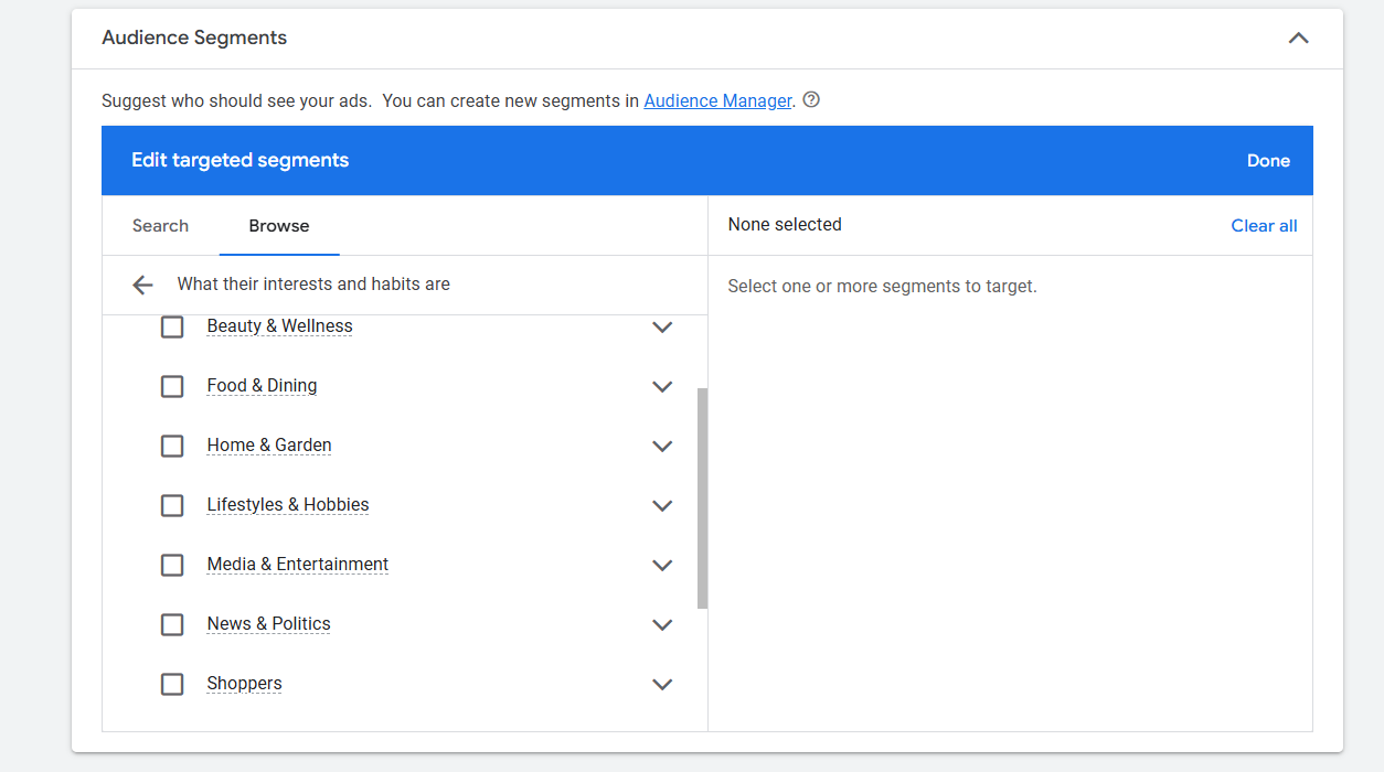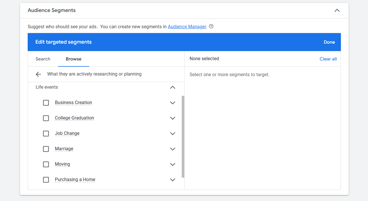 With this option, you can create a combined audience segment. This allows you to build your audience by incorporating Affinity, In-Market, and Life Events audiences. Additionally, you can also include custom segments in this combined list.