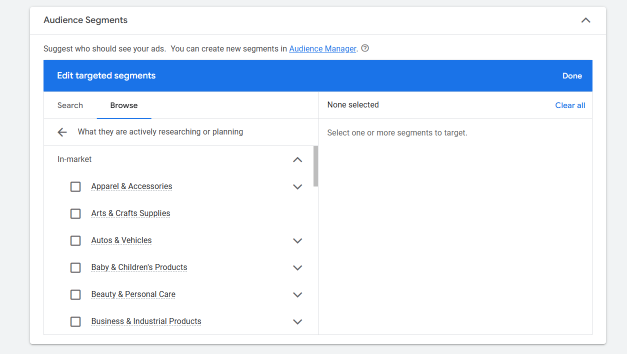 The ‘In-Market’ audience list is similar to the Affinity audience, but with a key difference: if someone falls under a category in this list, it indicates they are actively researching or planning to purchase the associated goods or services.