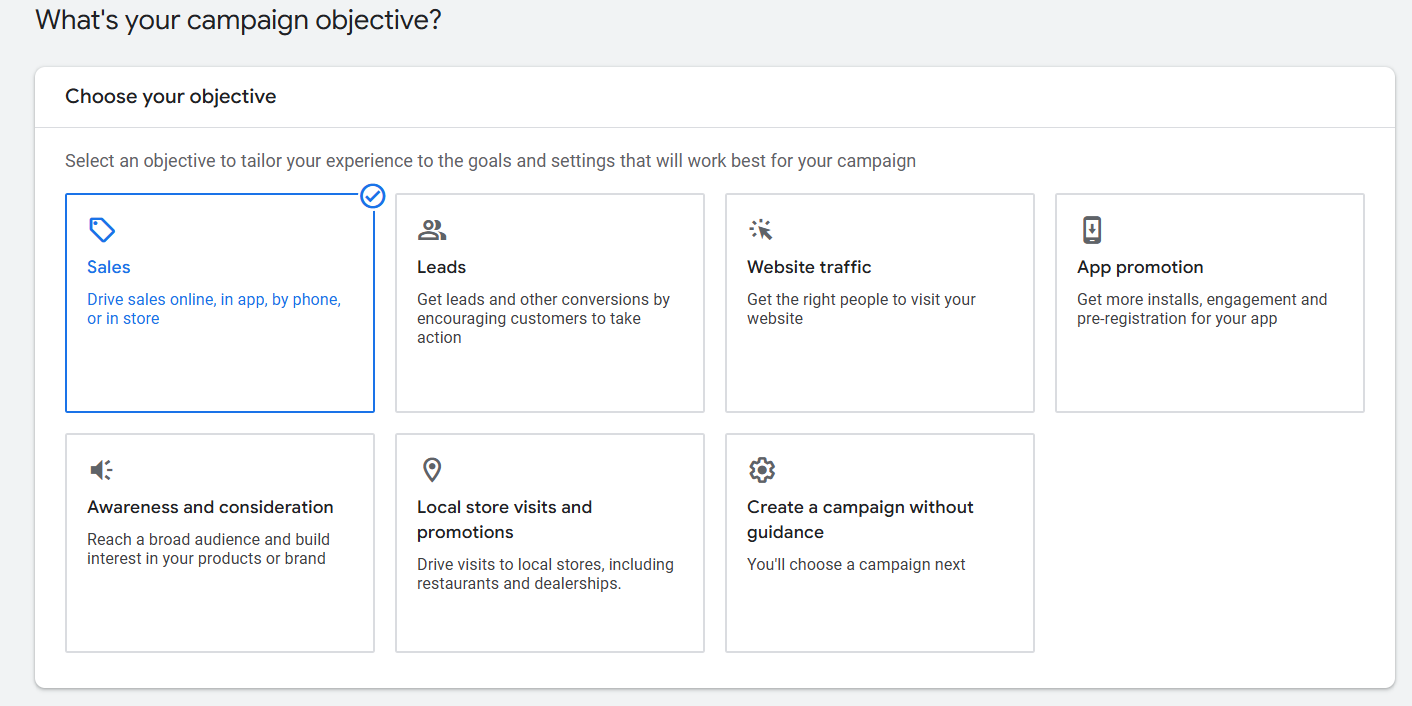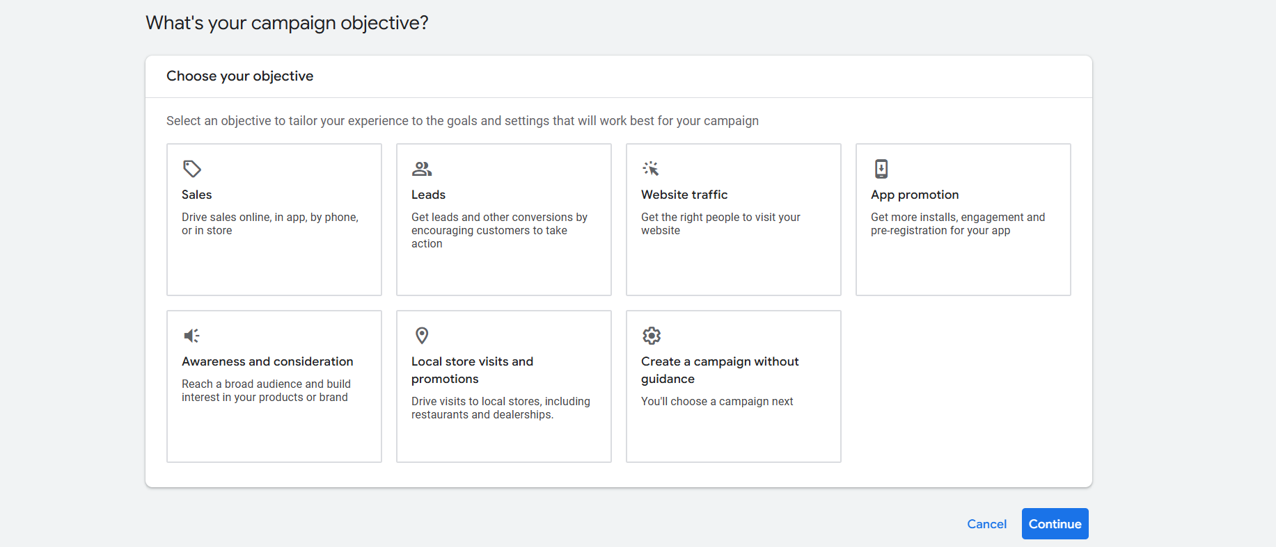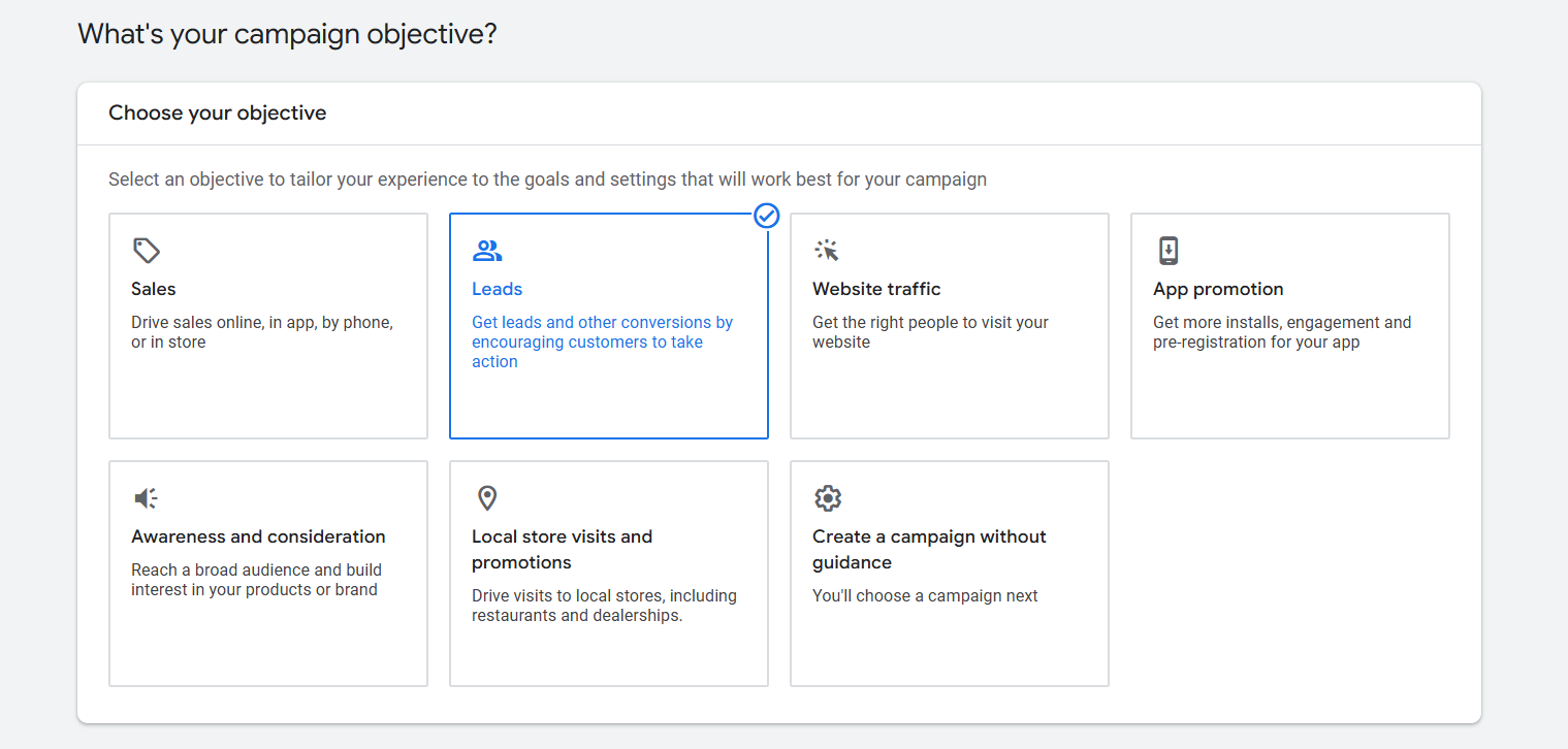 Leads: The goal of Google Ads’ Leads objective is to encourage prospective clients to express interest in your company by completing tasks like submitting a contact form, subscribing to a newsletter, or asking for more details.