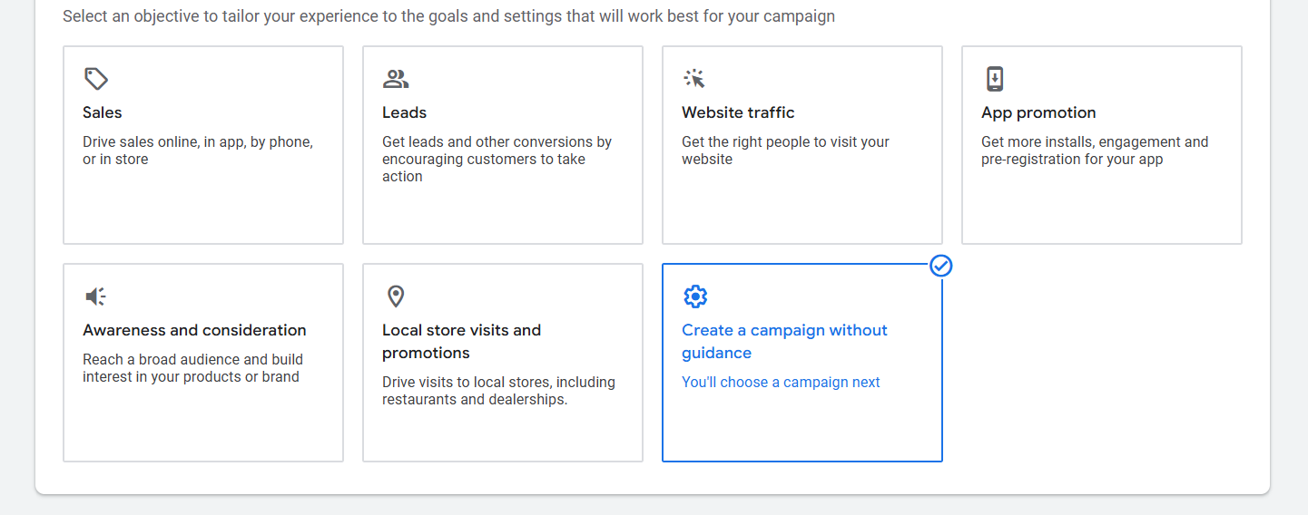 Create a Campaign Without Guidance: With the “Create a Campaign Without Guidance” option, you can start from scratch and create a campaign without any detailed instructions or recommendations. Making your own decisions about where to go and how to get there is similar to deciding to drive your car without a GPS.