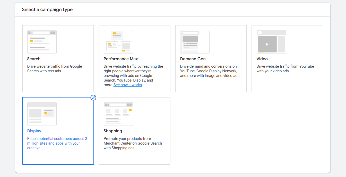 Display: You can display your ads as banners, photos, or videos on Google Display Network-affiliated websites and applications with the Display campaign type. These are the advertisements that appear on blogs, news websites, and even mobile applications.