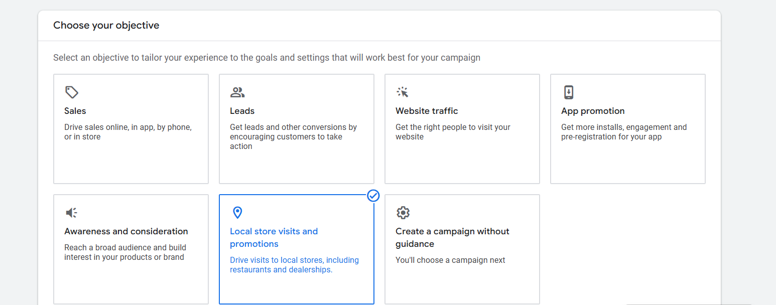 Local Store Visits and Promotions: When you want to increase the number of people who visit your physical store or place of business, you use the Local Store Visits and Promotions objective.