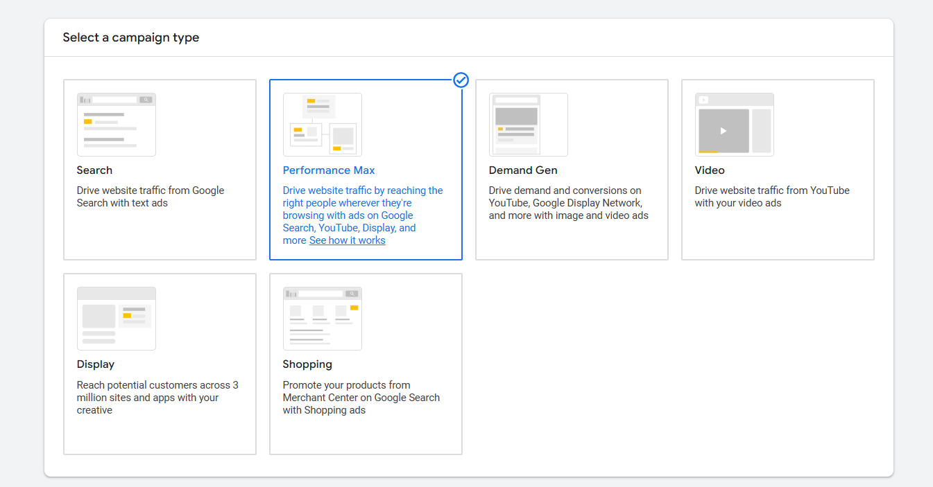 If you wish to streamline your advertising across all of Google’s platforms, you should choose the Performance Max campaign type. It’s ideal for companies that wish to expand their customer base without having to handle ads for every platform, such as Gmail, YouTube, or Search.