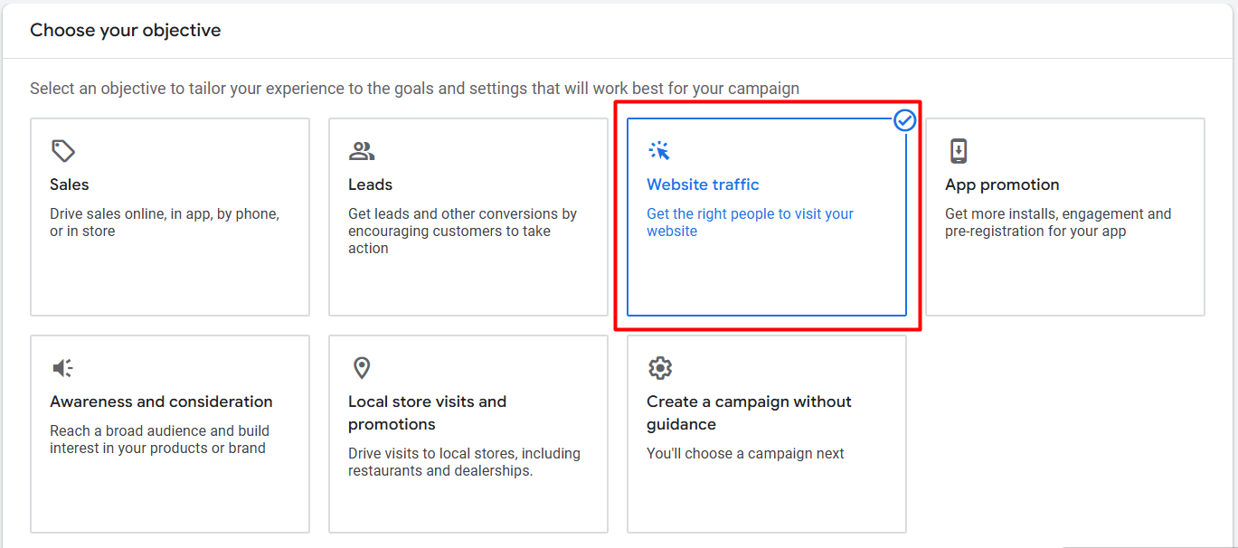 Website Traffic: The goal of Google Ads’ Website Traffic objective is to increase website traffic. Getting people to click on your advertisement and visit your website is the main goal.