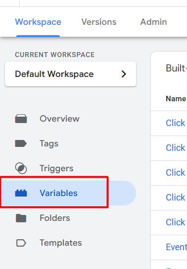 First go to your GTM and choose the variable section. Because first we have to create some variable to collect all of this data from our data layer to send to Google Ads accounts.