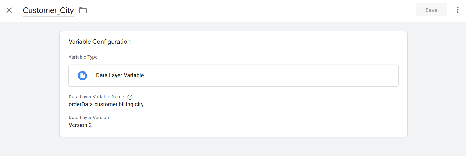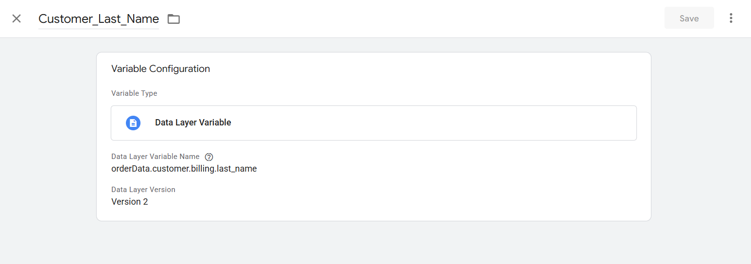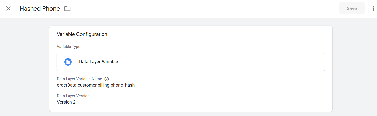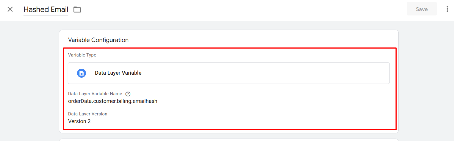 Now here you can see in which way we complete the setup of this variable. If you already know about the data layer, then I hope you got why we follow the structure. The value “emailhash” is under the “billing” object, and the billing is under the “customer” object, and lastly the customer is under the “orderData” object. That’s why we follow this way: object.object.object.value.