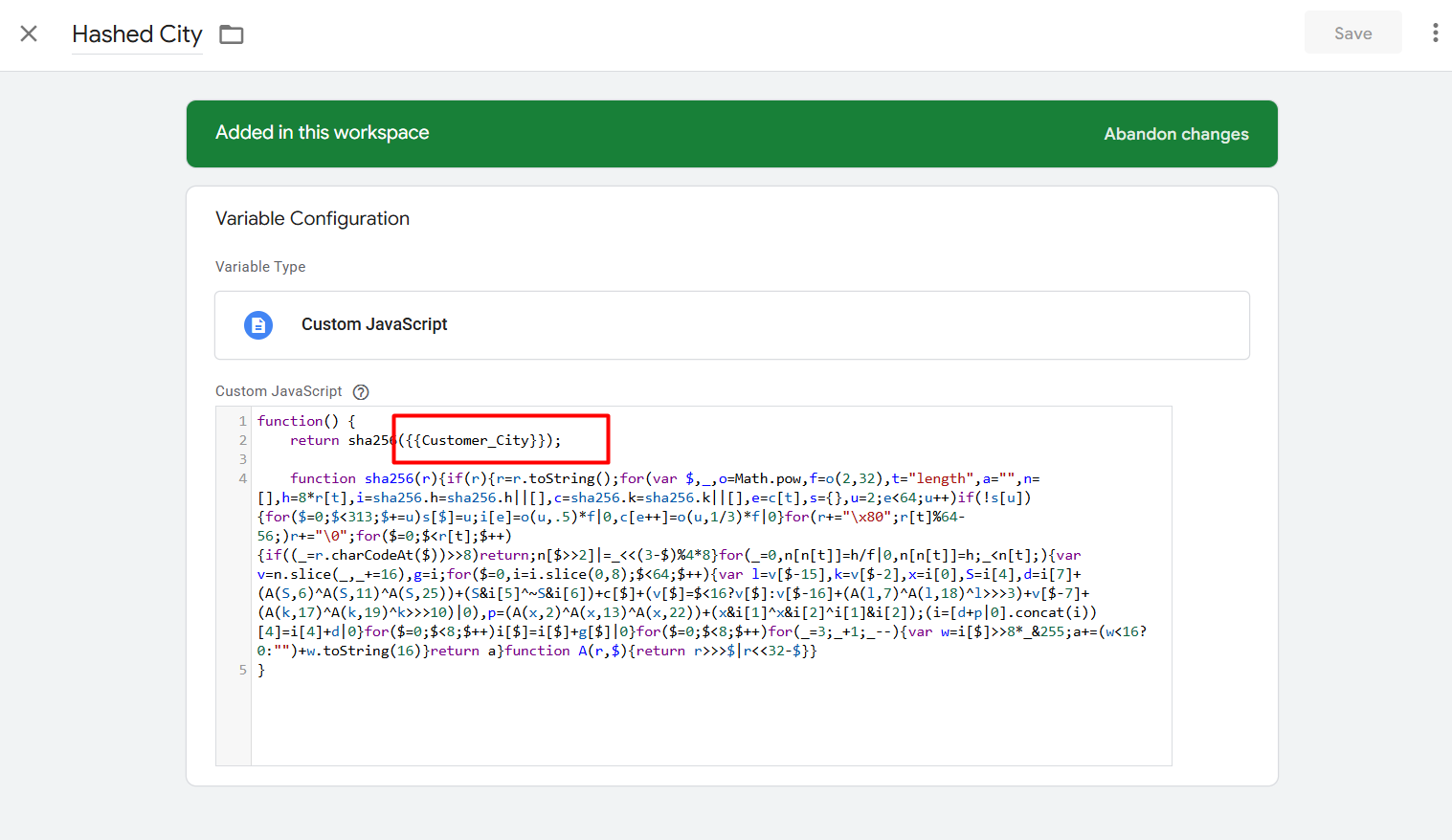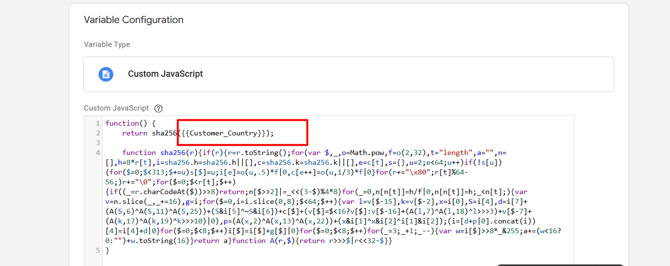 To do it again, go to your variable section and at the time select “Custom Javascript” as your variable type. At that time we will create a variable with custom JavaScript code for every single variable that we want to transform into a hashed format.