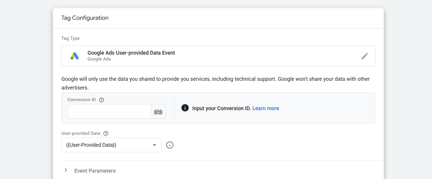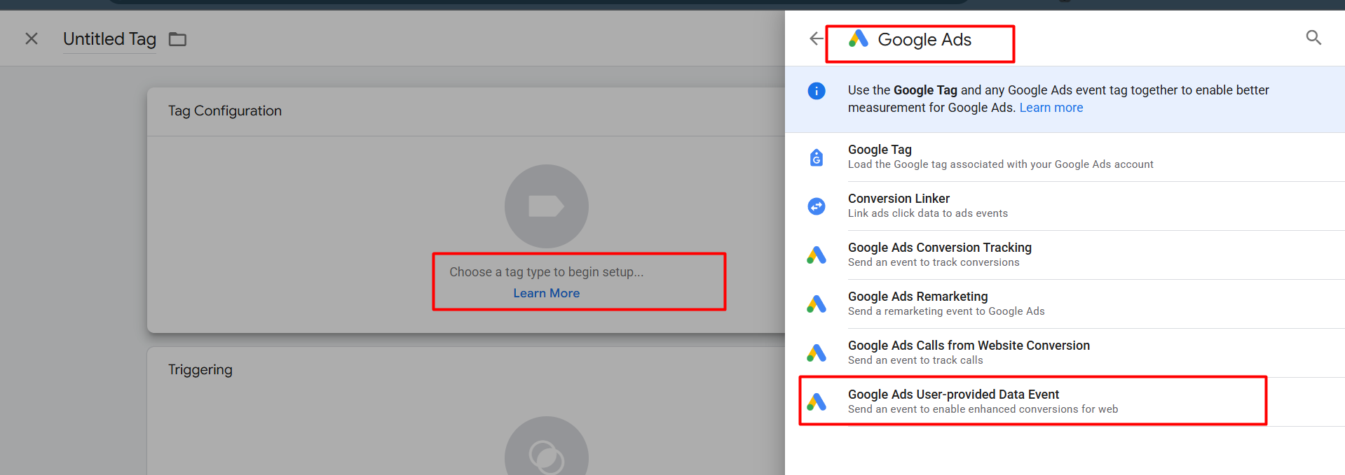 Now from here, as your tag type, select “Google Ads user-provided data event.” Let’s go.