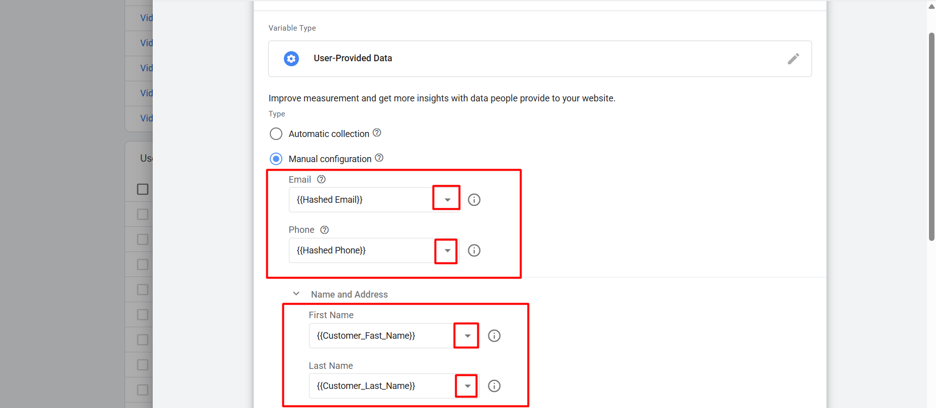After that, in the place of “User provided Data,” you can see we just select the last created variable, which is the one collecting all of the customer data in one place.