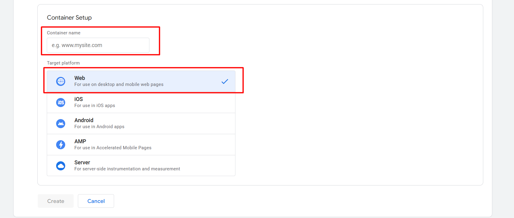 Now your job is to write down a name for your container. After that, as your container type, select web. This GTM will work for websites; that’s why we select web.