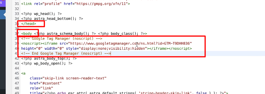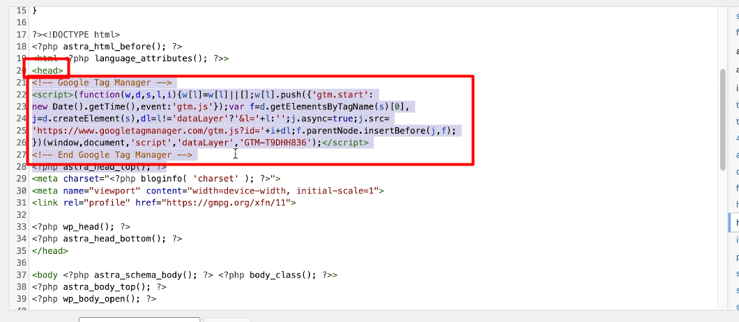 Here, you can see that we place the code immediately after the head section. Please follow the same approach for your site as well. Now, add the second code to your body section in the same way.