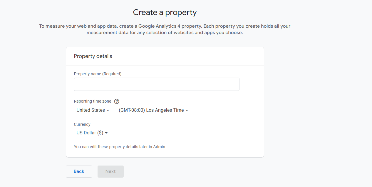 Now, in the property section, first enter the property name. Then, select the time zone based on your location and choose the currency that applies to you. Using this information, in the future all your reporting will be generated.