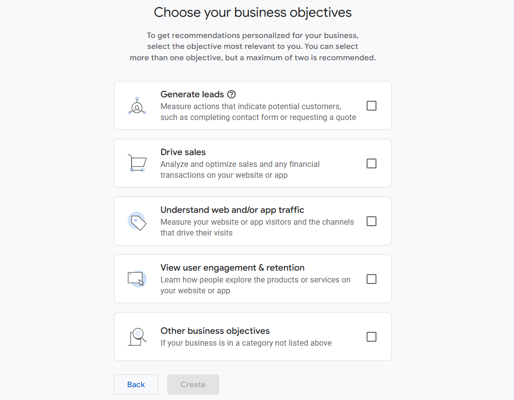 Now, select your business objectives and proceed to the next step. Here my objective is to drive sales. It’s important to pick perfectly because, according to the rules, your dashboard will be ready for you.
