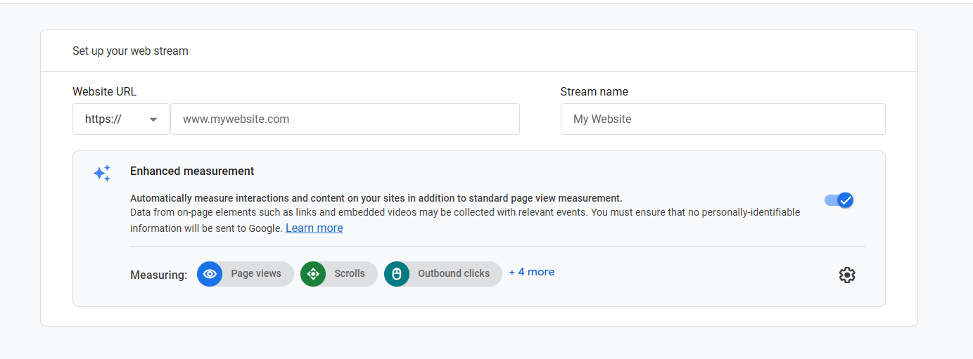 After that, here you can see that GA4 already gives us a list of the in-built measures. If you believe you can manage it independently later, please disable this option; otherwise, feel free to leave it enabled. Now create and continue.
