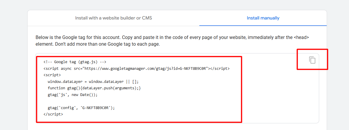 Here you will be able to see the tag provided by Google. As we said in our previous article, if you want to set up GA4 through the gtag tag, then you can simply add this code in the header section. But we will do it through GTM.