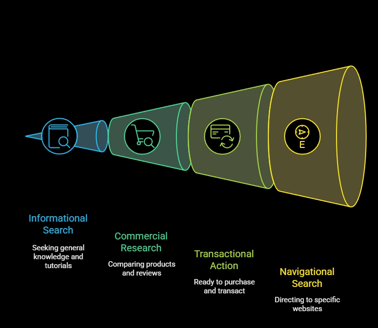 • Informational (Know): The goal of these searches is to find precise answers. Usually, the user is searching for general information, tutorials, or how-to guides. This category includes, for instance, “how to fix a flat bike tire,” where the goal is to learn without necessarily buying anything.