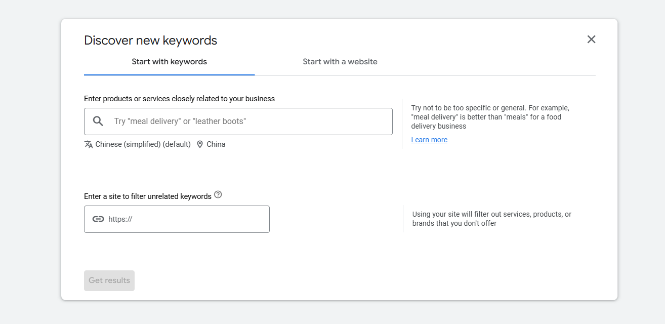 Here in the first position, you have to put some keywords to give ideas about your goods to Google Ads, or simply you can just use your website domain here in the next place. But we suggest using some keywords first to give ideas to Google.