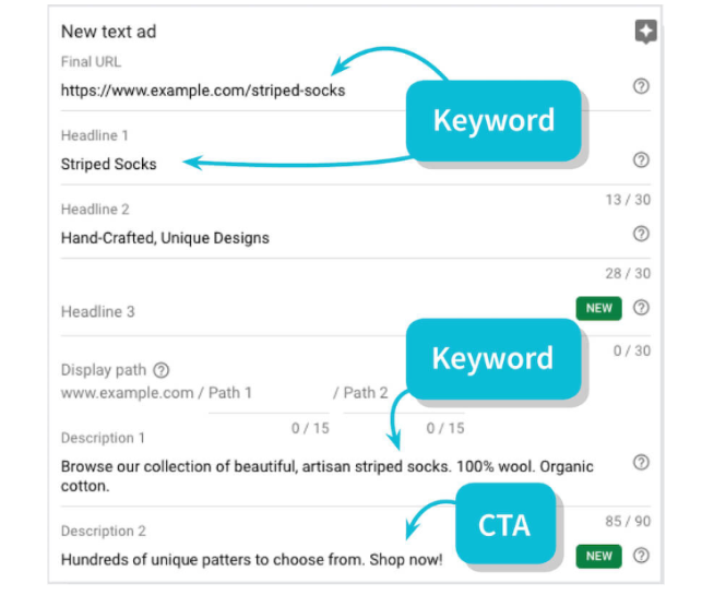 In a single ad, we get to be very creative! We can provide up to 15 different headlines (each limited to 30 characters) and four different descriptions (each with a 90-character limit). If you find yourself thinking, “I have way more than 15 keywords; how can I use them all?” don’t worry. Your keywords are likely all about the same main topic and are closely related.