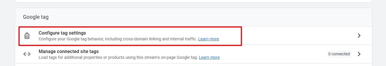 In GA4, we can filter out internal traffic in many ways, but first we must identify it via the IP address. To do it again, enter your “Data stream” and then scroll down to get the “Configure tag settings.” Enter to get the next options.