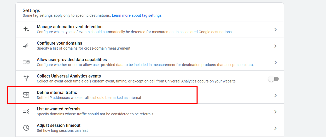 After entering “Configure tag settings”, if you scroll down, you will get the internal traffic definition section. Click on it.