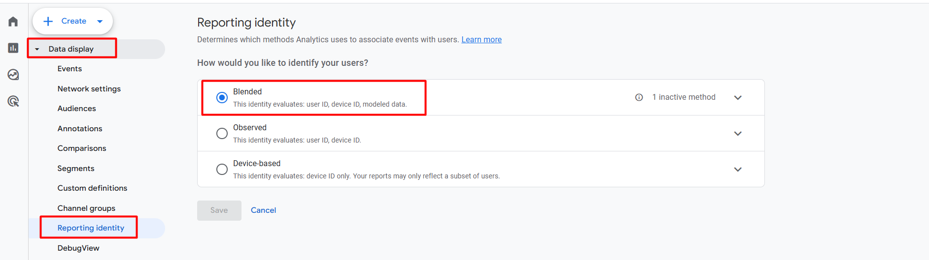 Also, you can do it in an advanced way where GA4 will use user ID, device, and modeled data. So to do it, come to the setting and enter in “Data display” > “Reporting identity.”