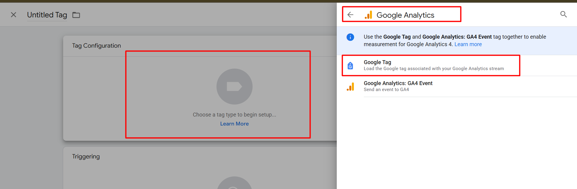 First go to your tag section in the GTM and create a new tag, but at the time, as the tag type, select “Google Tag” as your tag type.