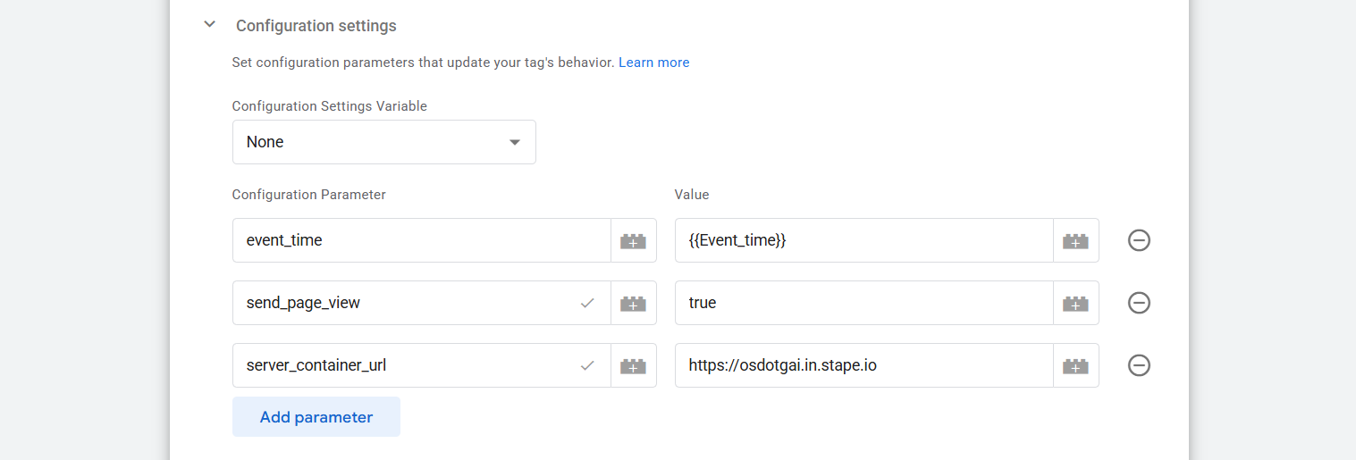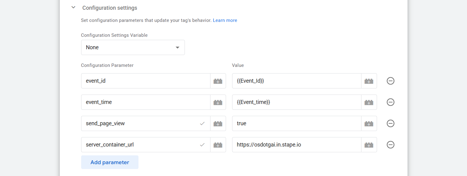 Now here in the “Configuration Parameter” place we are adding three parameters. You can remember that in the browser-side tracking we didn’t use any single parameter. But here on the server side we have to do it.