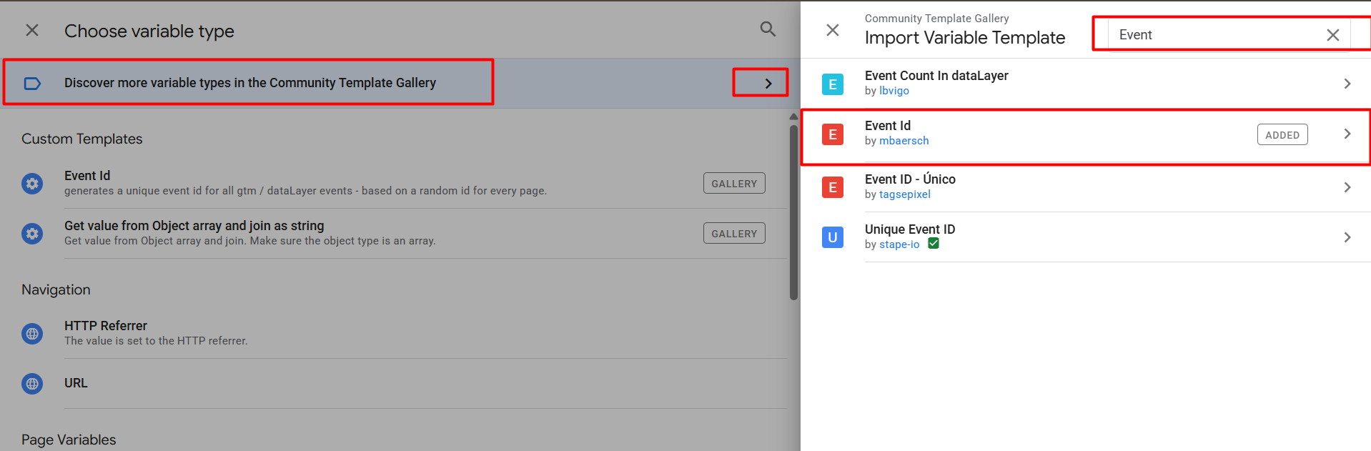 So from here, select search and select the Event ID variable template. Now after adding the new templates in the variable section, you can use it as your variable type.