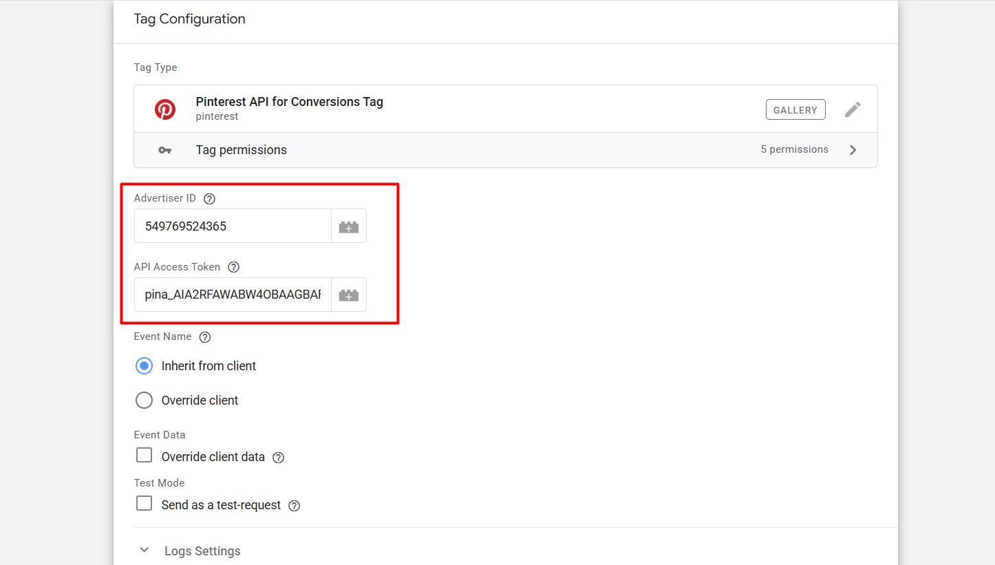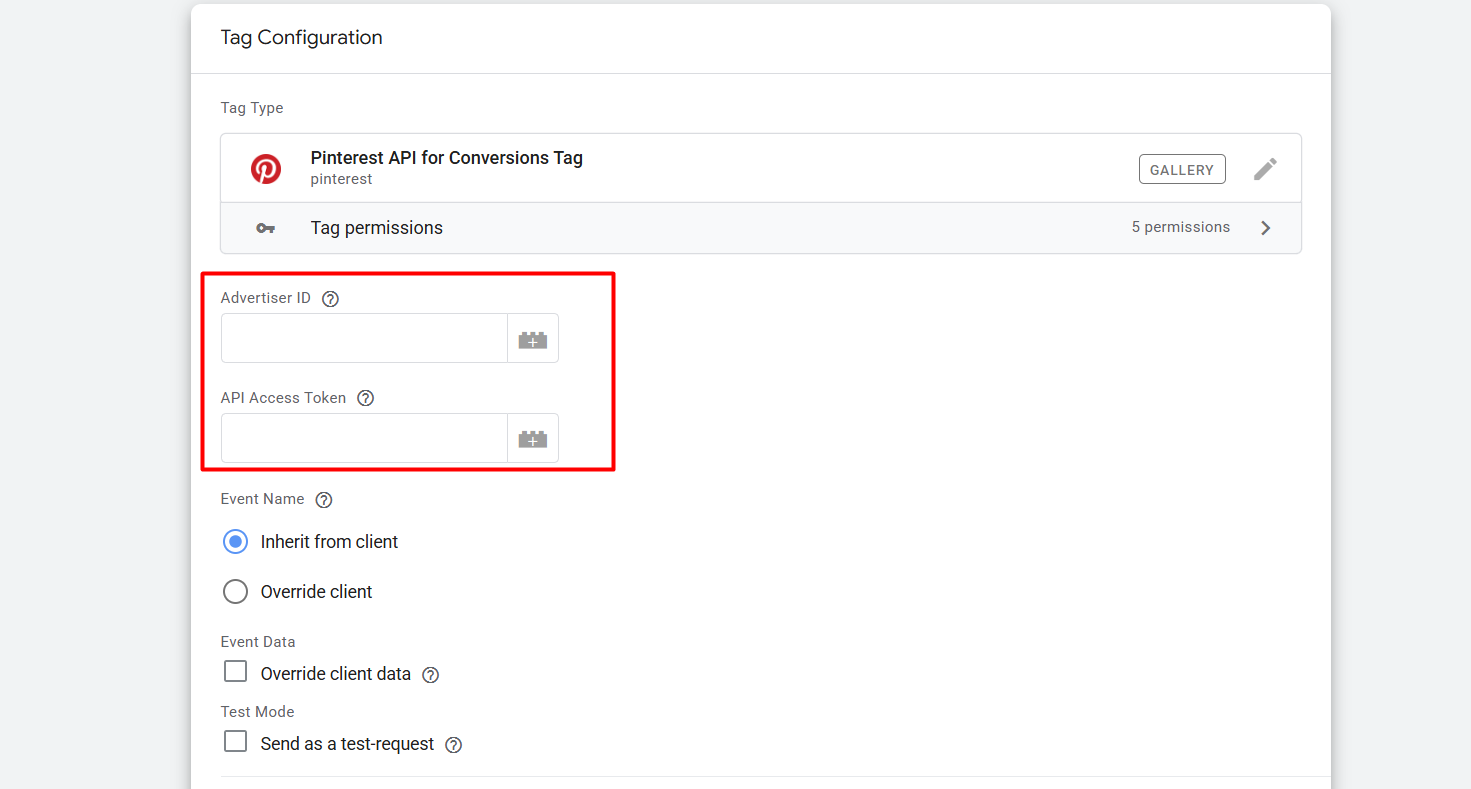 Now go back to the tags section and create a new tag, and as the tag type, select the recently added Pinterest API.