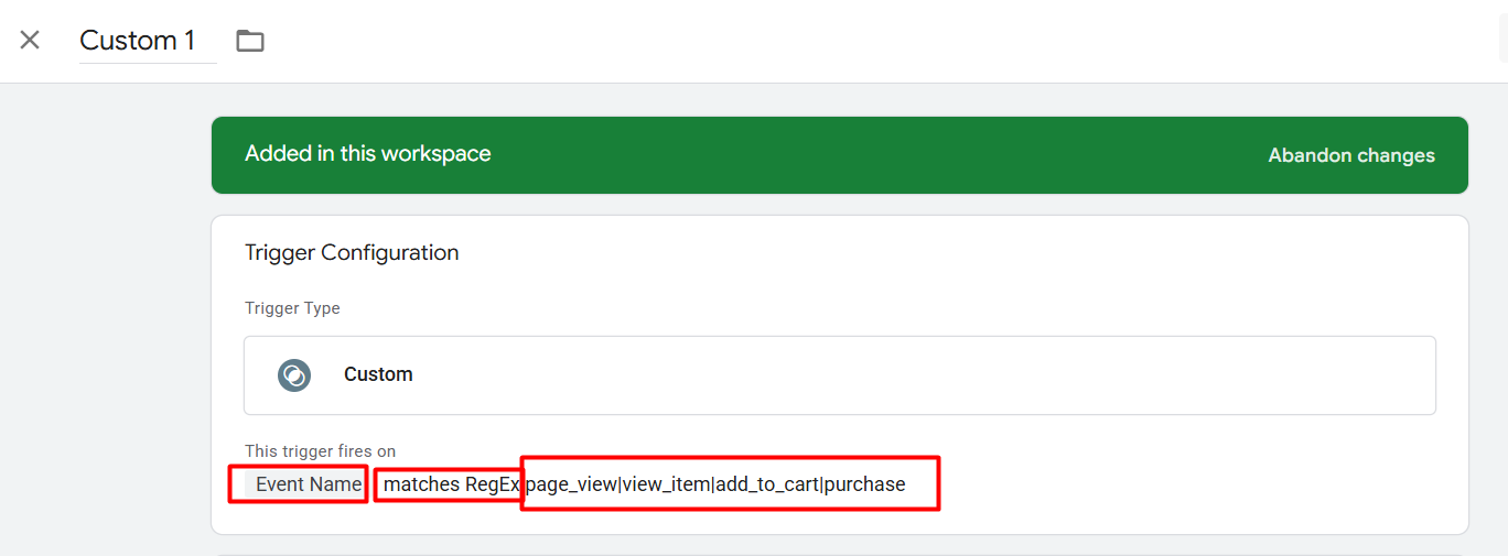 You enter “page_view|view_item|add_to_cart|purchase” in the second field. This regular expression instructs GTM to start up whenever any of these things take place. Because the | symbol is used to separate the various event names, this trigger will activate for any of these events, enabling you to record actions at every stage of the customer journey, from page viewing to purchase.