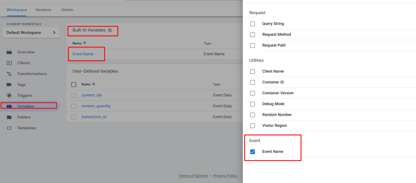 But in the first place, if you find that the “Event Name” is missing, then go to your variables section, and from the built-in variables, select the “Event Name,” and you’re done.
