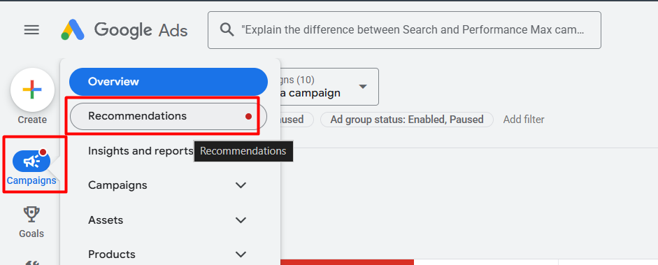 To check and turn it off, first go to the “Recommendations” section in your Google Ads account.
