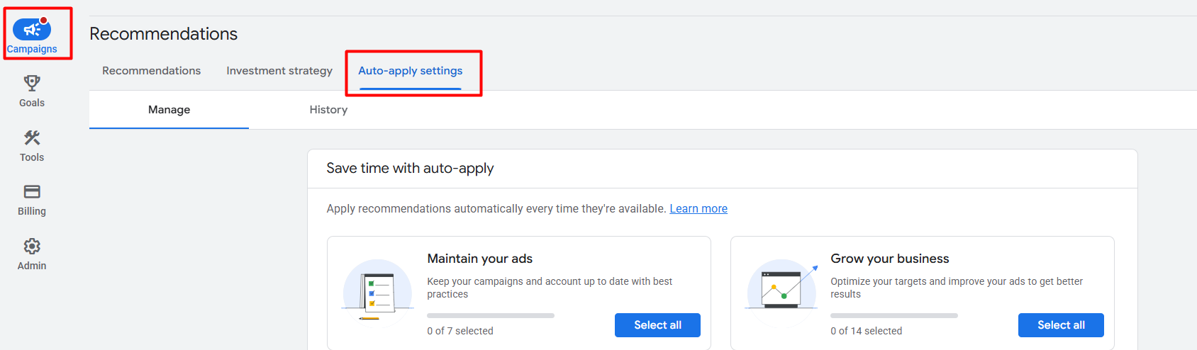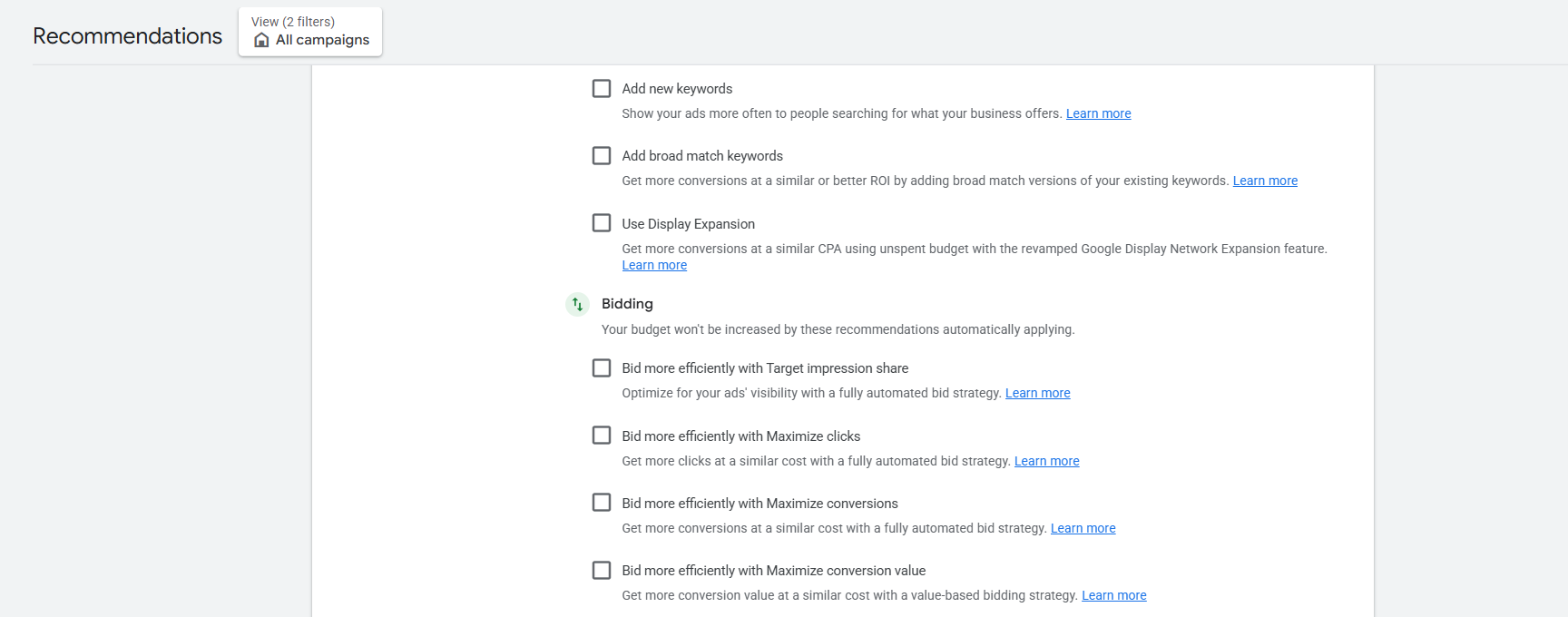 So it’s important to turn off these automatic options from your “Recommendations” section to stay in control of your ad account, because you won’t want to give Google control to change important campaign settings without your knowledge.