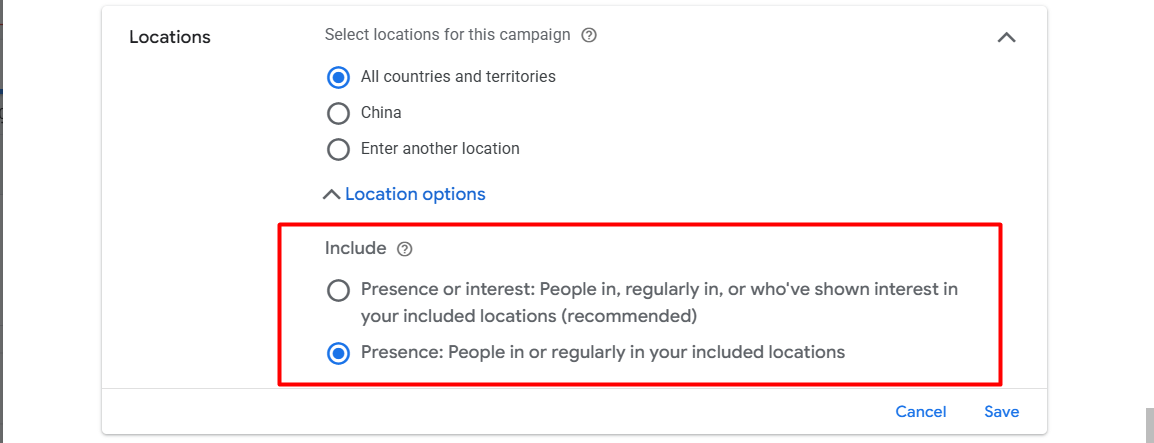 It’s important to remember that targeting isn’t the whole story; your business’s operational capacity is a factor too. If you opt for the “Presence” setting, your ad will only be shown to people who can actually buy what you’re selling from the area you’re focusing on.