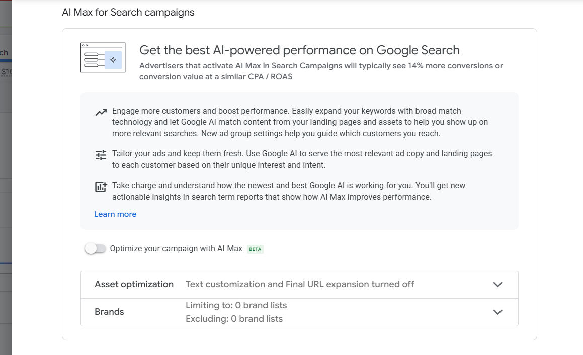 When you go to the settings section of your campaign, you will see this section. You will see a ‘Toggle Button’ or switch there, through which it can be controlled. When you activate the option using this button, Google will automatically start the AI Max process within that campaign.