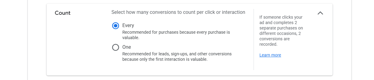 However, if your business is an e-commerce or online sales centre, the “Every” option is the right one. Because here every single piece of purchase data is valuable.