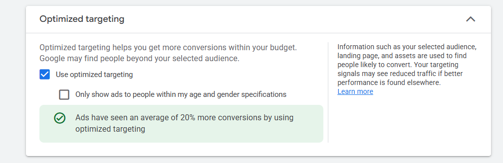 ‘Optimized Targeting’ is an important feature in Google Ads display, video and especially Demand Gen campaigns. It is enabled by default in Performance Max (PMax) campaigns.