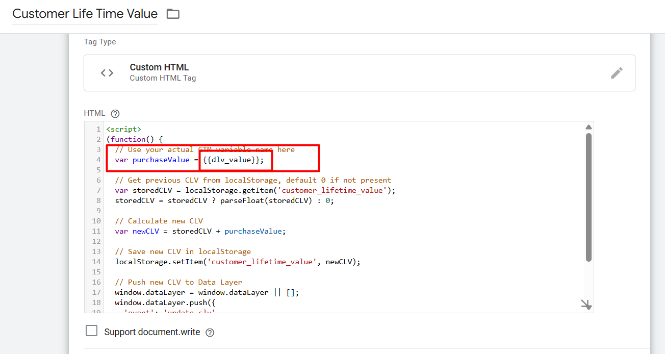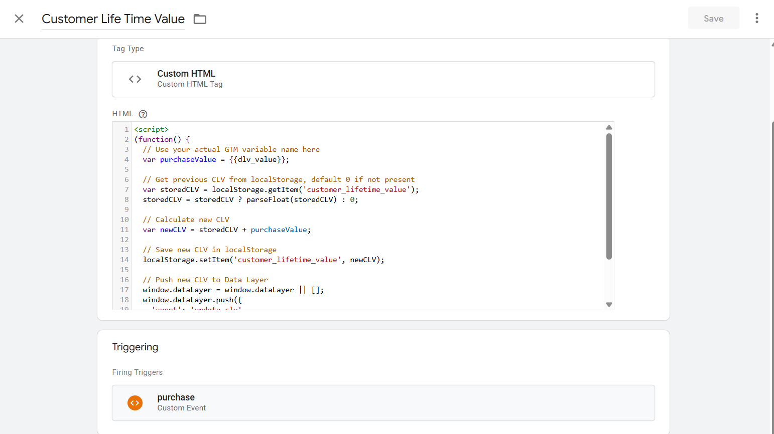 <script> (function() { // Use your actual GTM variable name here var purchaseValue = {{dlv_value}}; // Get previous CLV from localStorage, default 0 if not present var storedCLV = localStorage.getItem('customer_lifetime_value'); storedCLV = storedCLV ? parseFloat(storedCLV) : 0; // Calculate new CLV var newCLV = storedCLV + purchaseValue; // Save new CLV in localStorage localStorage.setItem('customer_lifetime_value', newCLV); // Push new CLV to Data Layer window.dataLayer = window.dataLayer || []; window.dataLayer.push({ 'event': 'update_clv', 'customer_lifetime_value': newCLV }); })(); </script>
