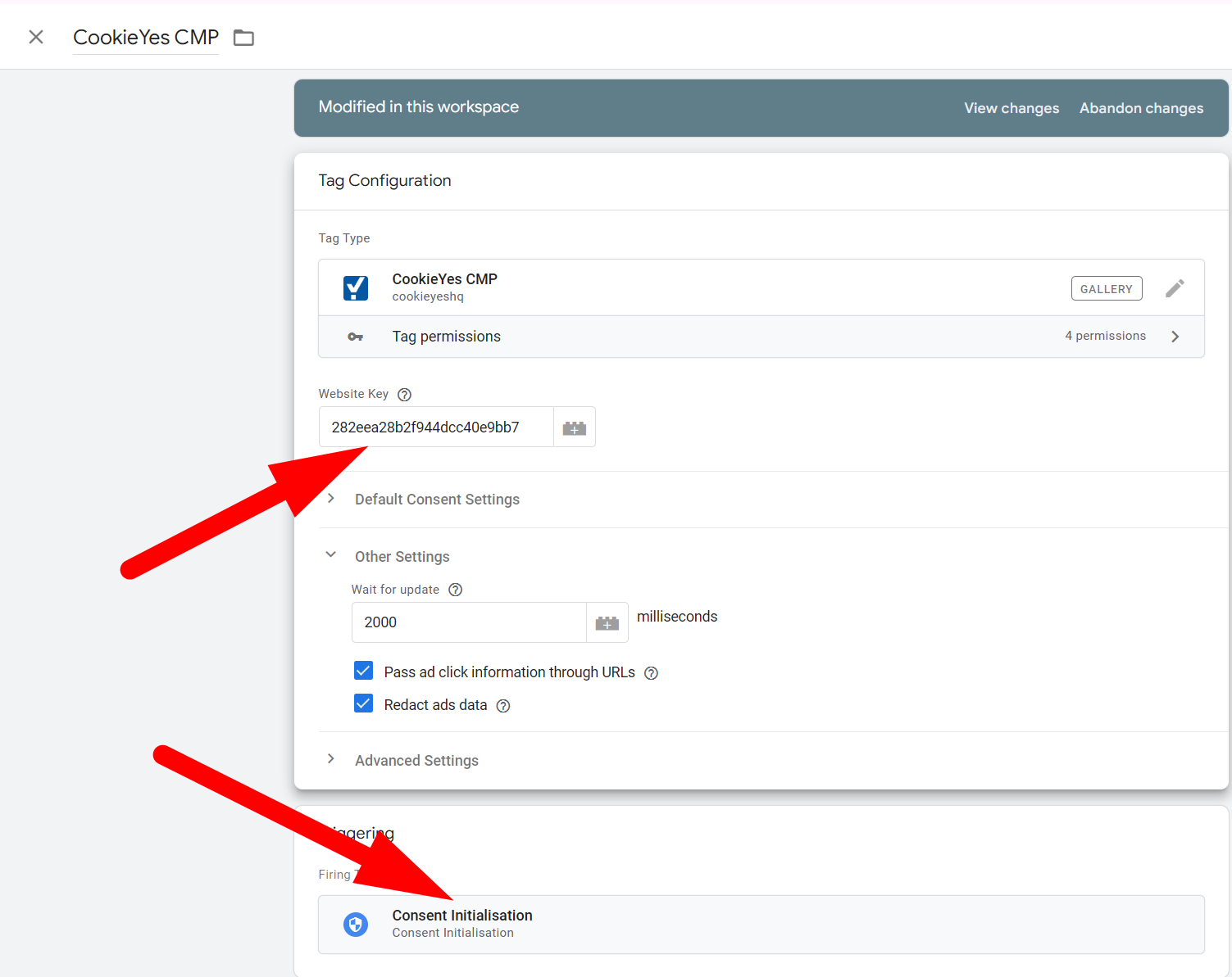 here in the first place, paste your copied code from your “CMP,” and in the trigger section, select “Consent Initialization.” Done.