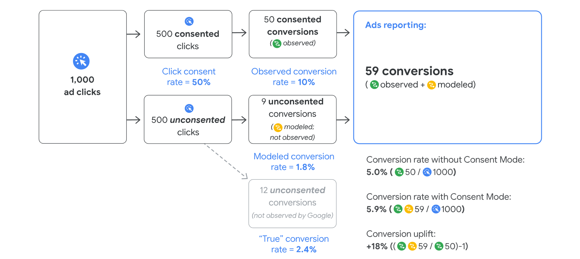 If users agree to tracking, data is collected. If they don’t, modeled data is used to estimate conversions without violating privacy.