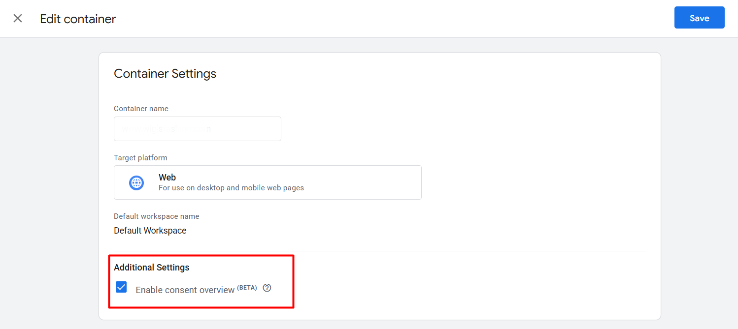 And from the “Container Settings,” please enable the “Consent overview and save.” Now again, get back to the Tag section.